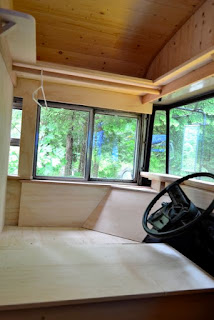 | Trim has been added along the arch of the ceiling. Small detail, but so important for the overall look of the bus :)! (The wood covering the metal rod has been removed while I varnish the shelves) |
